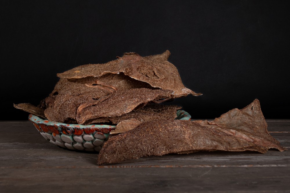 Het is erg taai, maar wel makkelijk te knippen in kleinere stukken.